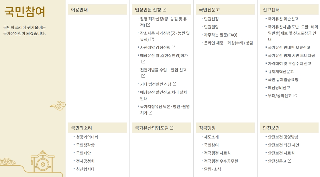 4. 국민참여 메뉴는 말 그대로 국민들이 직접 참여할 수 있는 창구예요. 청장과의 대화나 국민 생각함, 국민 제안 같은 소통 공간을 통해서 국민들이 국가유산 정책에 직접 목소리를 낼 수 있죠. 여기에 법정 민원 신청 메뉴가 있어서 촬영 허가나 장소 사용 허가, 매장유산 발굴 허가 등을 편리하게 온라인으로 신청할 수 있어요. 천연기념물 수입·반입 신고도 여기에서 할 수 있고요. 다양한 신고센터도 운영되고 있어서 문화재나 유산과 관련된 문제를 바로 신고할 수 있답니다.