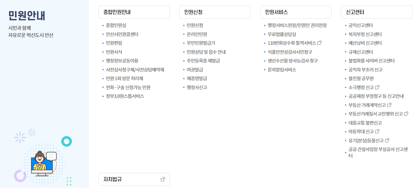 3. 민원안내 메뉴도 참 유용해 보였는데요, 민원을 처리해야 할 일이 있을 때 여기서 도움을 받을 수 있겠더라구요. 온라인 민원 신청도 가능하고, 민원 서식 같은 것도 쉽게 다운받아볼 수 있었어요. 사전 신청 구제 같은 정보도 포함되어 있어서, 직접 방문하지 않고도 온라인으로 많은 업무를 처리할 수 있는 시스템이 구축되어 있는 점이 참 편리하다는 생각이 들었어요. 요즘처럼 바쁜 일상 속에서 이런 기능이 있다는 게 얼마나 다행인지 몰라요.