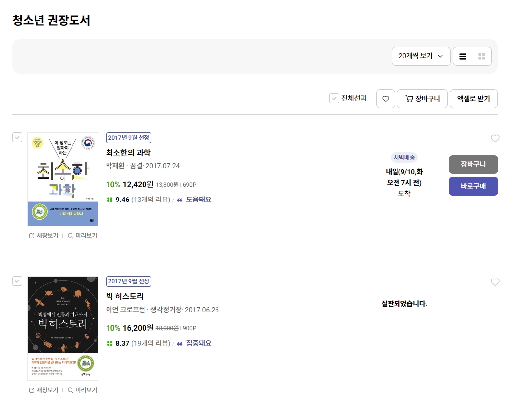 4. 일단 청소년 권장도서를 클릭해보니, 최소한의 과학부터 빅 히스토리까지 여러 책들이 나왔습니다. 어, 이거 좀 흥미롭겠는데?라는 생각이 들어서 책 제목들을 하나하나 살펴봤어요.