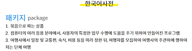 2. 패키지라는 단어는 영어로도 자주 쓰이잖아요? 사전에서는 package라는 단어로 여러 의미를 담고 있는데, 일괄적인 것, 꾸러미, 그리고 (제안, 계획 등의) 일괄 처리라는 다양한 뜻이 있더라구요. 이런 뜻들은 우리가 일상에서 패키지를 어떻게 쓰는지 잘 보여주는 것 같아요.