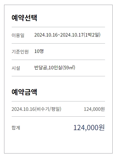 7. 예약 선택이 완료되면 이용일과 인원, 그리고 선택한 숙박 시설의 정보를 확인할 수 있어요. 최종 예약 금액도 상세히 표시되니, 예약 과정을 쉽게 마칠 수 있죠.