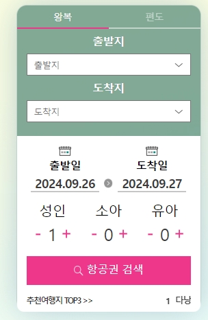 2. 출발지와 도착지를 설정하고 날짜를 선택한 후 항공권을 검색할 수 있어요. 성인, 소아, 유아 인원을 설정해서 가족 여행이나 친구와 함께 떠날 때도 아주 편리하게 사용할 수 있답니다. 추천 여행지도 제공하고 있어서 여행 계획을 세울 때 참고하면 좋겠네요.