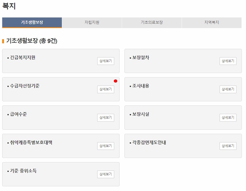 복지 페이지에서 기초생활보장에 관한 9가지 항목 중 수급자 선정기준을 클릭하여 기초생활보장제도의 수급자 선정 기준에 대한 정보를 확인할 수 있습니다.