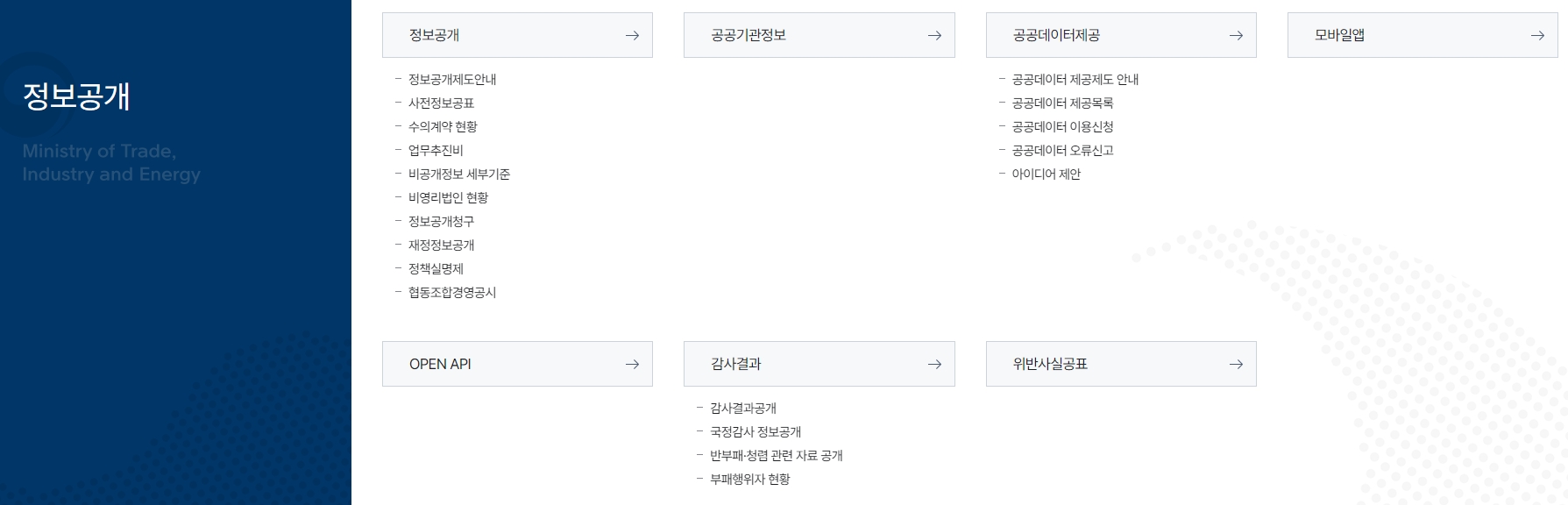 7. 기관 소개와 관련된 다양한 정보와 함께 산업부의 주요 활동과 역할을 알 수 있습니다. 기관 소개 메뉴에서는 산업부의 연혁과 미션, 그리고 각종 기관의 역할 및 주요 부서 정보를 확인할 수 있습니다. 장관 및 차관의 일정과 행사 관련 정보도 쉽게 찾아볼 수 있으며, 역대 장관 및 본부장의 활동도 정리되어 있습니다. 또한, 각종 관련 사이트도 연결되어 있어 국민들이 필요한 다른 부처나 기관 정보도 손쉽게 접근할 수 있습니다.