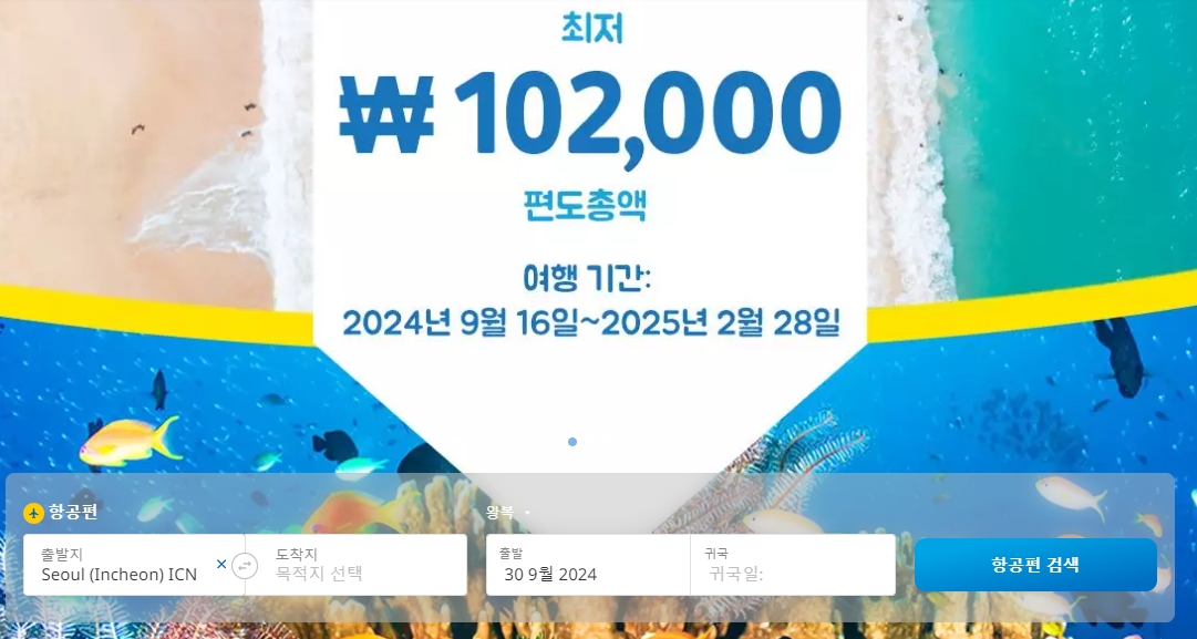 2. 홈페이지 메인 화면에서 가장 눈에 띄는 점은 여행 일정과 예산에 맞는 항공권을 쉽게 검색할 수 있다는 거예요. 최소 102,000원이라는 합리적인 가격을 앞세운 항공권은 여행자들에게 매력적이죠. 여행 기간도 넉넉하게 제공되어, 2024년 9월 16일부터 2025년 2월 28일까지 다양한 여행 일정을 계획할 수 있어요.