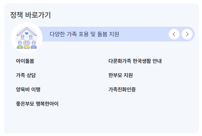 9. 마지막으로 정책 바로가기 코너에서는 다양한 가족 지원 정책을 안내하고 있어요. 아이돌봄, 다문화가족 한국생활 안내, 한부모 지원, 가족 상담 등 가족과 관련된 다양한 지원 프로그램을 한눈에 볼 수 있습니다.
