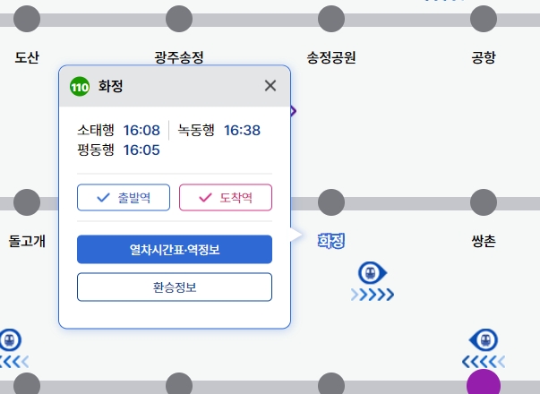 5. 열차 시간표를 보면 소태행, 녹동행 등 다양한 방향의 열차 정보를 한눈에 볼 수 있어요. 예를 들어 화정역에서 출발하는 시간대별 열차 정보를 확인하면 소태행 열차와 녹동행 열차가 각각 몇 시에 출발하는지 자세히 안내되어 있어요.