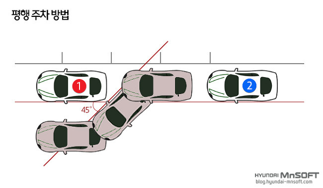 평행주차는 주차할 차량과 평행하게 서서 시작합니다. 핸들을 오른쪽으로 최대한 돌린 후 후진하다가 차량이 45도 각도에 도달하면 핸들을 중앙으로 돌려 더 후진합니다. 이후 핸들을 왼쪽으로 최대한 돌려서 주차를 완료합니다. 평행주차는 후진주차에 비해 상대적으로 한 번에 주차하기 쉬운 편입니다.