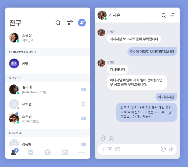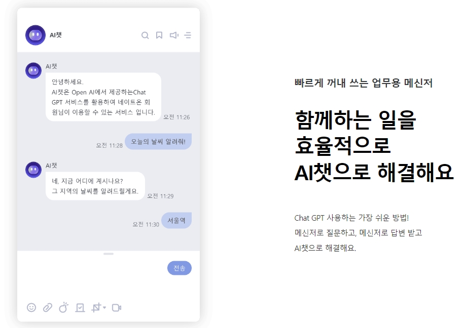 5. 네이트온의 또 다른 특징 중 하나는 AI 챗봇 기능입니다. 이 기능을 통해 간단한 작업을 AI에게 맡길 수 있으며, 다양한 질문에 대한 답변을 받을 수 있습니다. 카카오톡의 헤이 카카오와 같은 AI 서비스처럼, 점점 더 많은 메신저들이 이러한 인공지능 기능을 도입하고 있는데요. 네이트온 역시 이러한 흐름에 맞추어 AI 챗 기능을 제공하며, 이를 통해 더 편리한 대화와 작업 처리가 가능합니다. 향후 더 많은 업데이트를 통해 이 기능이 더욱 발전할 것으로 기대됩니다.