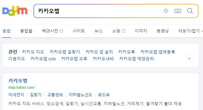 1. 카카오맵으로 들어갑니다. 카카오맵은 다음 지도의 최신 버전으로, Daum 지도에서 제공하던 모든 기능들을 포함하고 있으며, 색상과 인터페이스가 새로워졌습니다. 첫 화면에서부터 직관적인 디자인을 제공하며, 사용자들이 원하는 검색창과 주요 기능을 쉽게 찾을 수 있도록 배치되어 있습니다. 길찾기, 지도 보기, 주변 검색 등 다양한 기능을 활용할 수 있는 메뉴가 화면 상단에 배치되어 있으며, 이곳에서 기본적인 사용법을 시작할 수 있습니다.