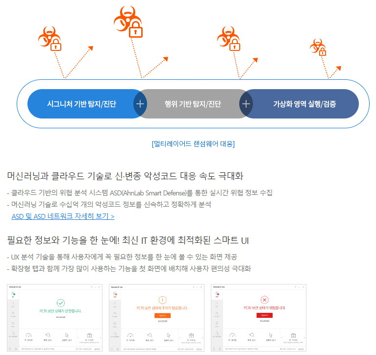 그 외에 들어온 김에 v3 백신에 관해서 특징을 몇가지 보고 있는데 일반적인 이야기들을 적어 놓았습니다. 랜섬웨어 진단 강화를 위한 가상공간 격리 검사, 머신러닝과 클라우드 기술로 신 변종 악성코드 신속 대응, 안티랜섬웨어, 랜섬웨어 보안폴더 기능 통합, Ux분석 기술을 통해 IT환경에 최적화된 UI 제공이네요.