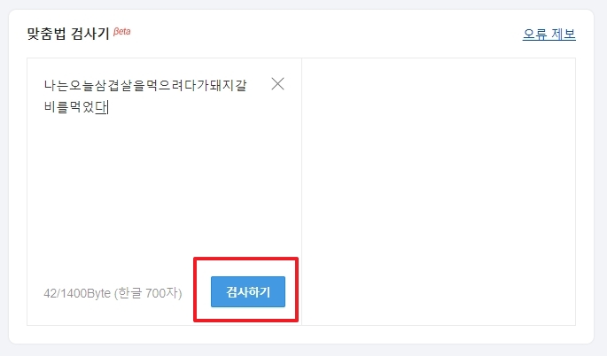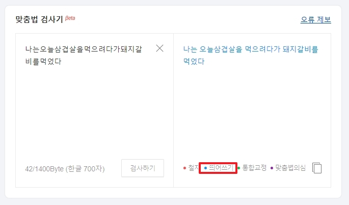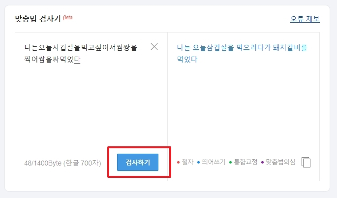2. 띄어쓰기가 되어 있지 않은 문장을 입력하고 검사 버튼을 클릭하면 오류를 자동으로 표시해 줍니다. 파란색 표시가 나타난 부분이 수정된 내용입니다.