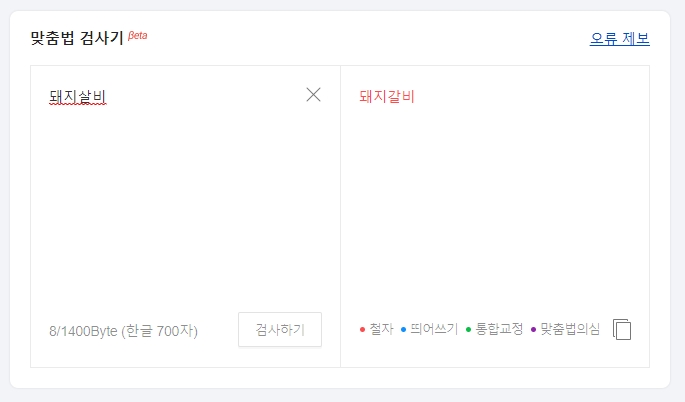 5. 돼지갈비와 같이 철자를 일부러 틀리게 입력해 보면 빨간색으로 오류가 표시되며, 올바른 단어로 쉽게 수정할 수 있는 기능을 확인할 수 있습니다.