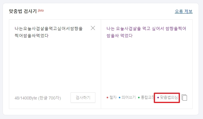 4. 맞춤법 의심 단어가 표시될 때는 직접 확인 후 수정할 수 있으며, 필요한 경우 관련 설명도 제공됩니다.