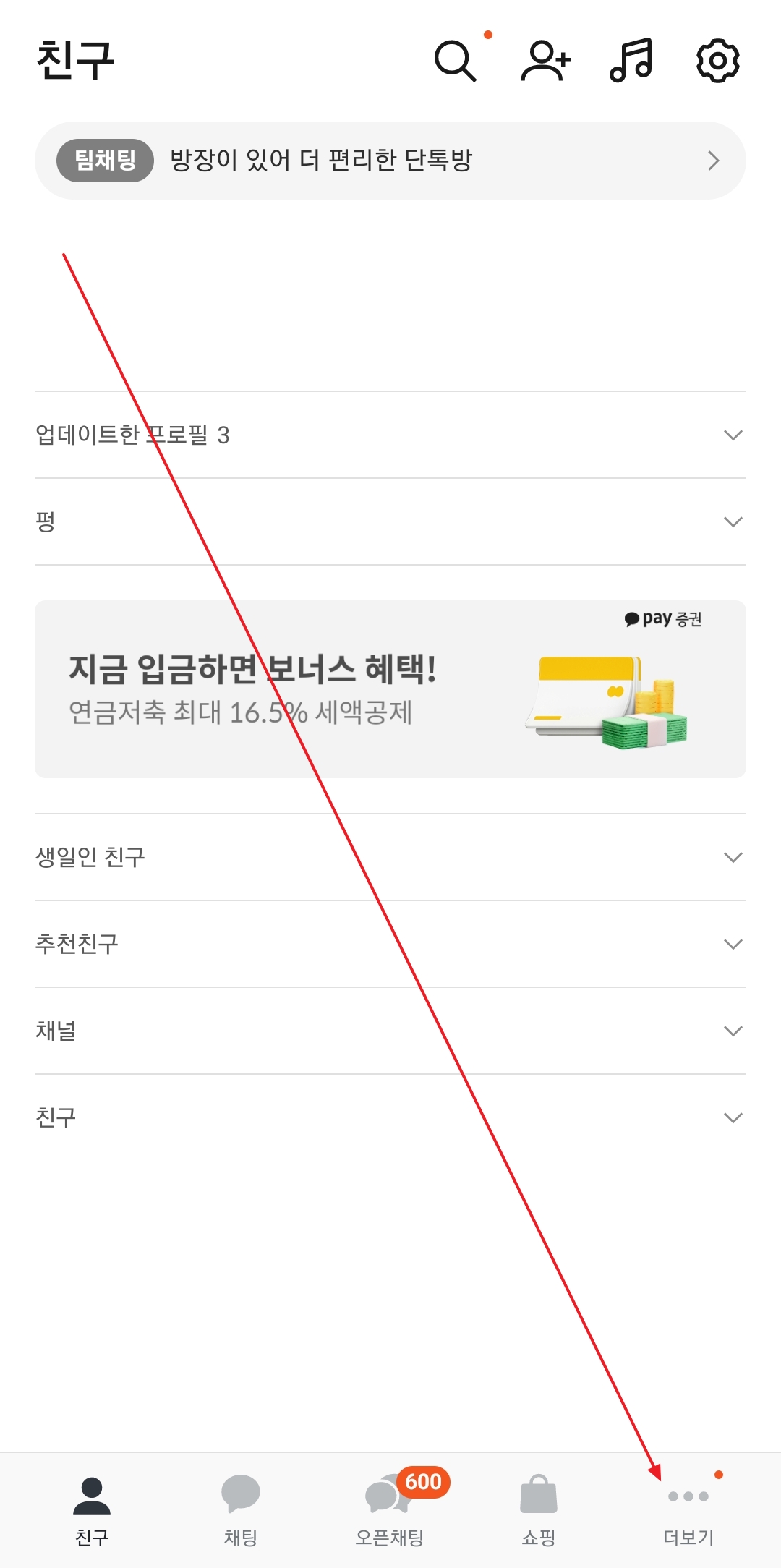 1. 카카오톡을 실행한 후, 화면 하단 오른쪽에 위치한 점 세 개 모양의 더보기 버튼을 클릭합니다. 이 버튼은 카카오톡에서 다양한 기능과 설정에 접근할 수 있는 시작점으로, 클릭하면 더보기 메뉴 화면으로 이동하게 됩니다.
