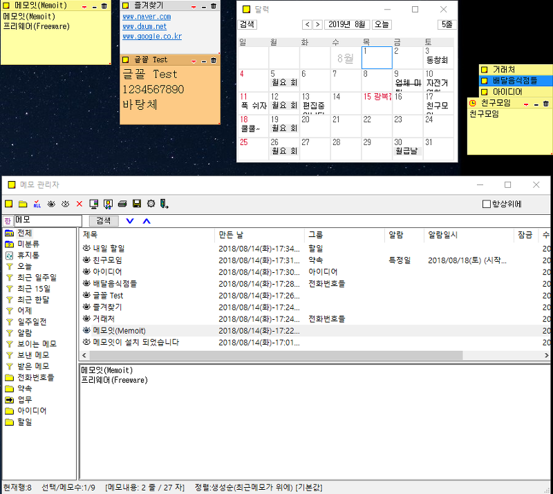 또한, 달력을 통해 메모를 시각적으로 확인할 수 있으며, 다양한 색상과 카테고리로 메모를 분류할 수 있어 직관적인 관리가 가능합니다. 바탕화면에 항상 표시되도록 설정할 수 있어 잊지 않고 확인할 수 있습니다.