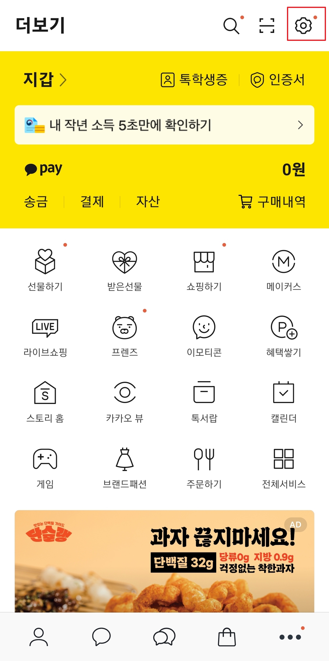 2. 더보기 메뉴에 진입한 후, 우측 상단에 있는 톱니바퀴 모양의 설정 버튼을 클릭합니다. 이 버튼을 통해 카카오톡 설정 페이지로 이동할 수 있습니다.