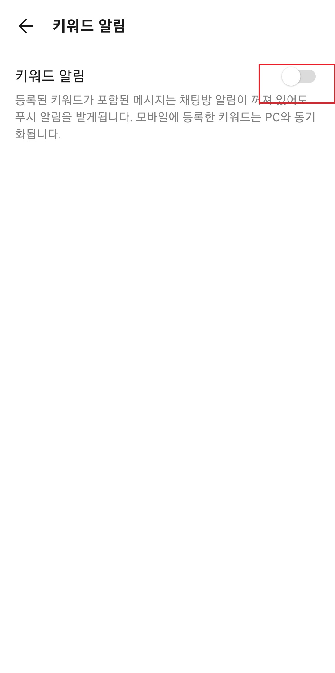 5. 기본적으로 키워드 알림은 비활성화 상태일 수 있습니다. 이 경우, 오른쪽에 있는 회색 버튼을 클릭하여 키워드 알림 기능을 활성화합니다. 버튼이 노란색으로 바뀌며 활성화 상태가 됩니다.