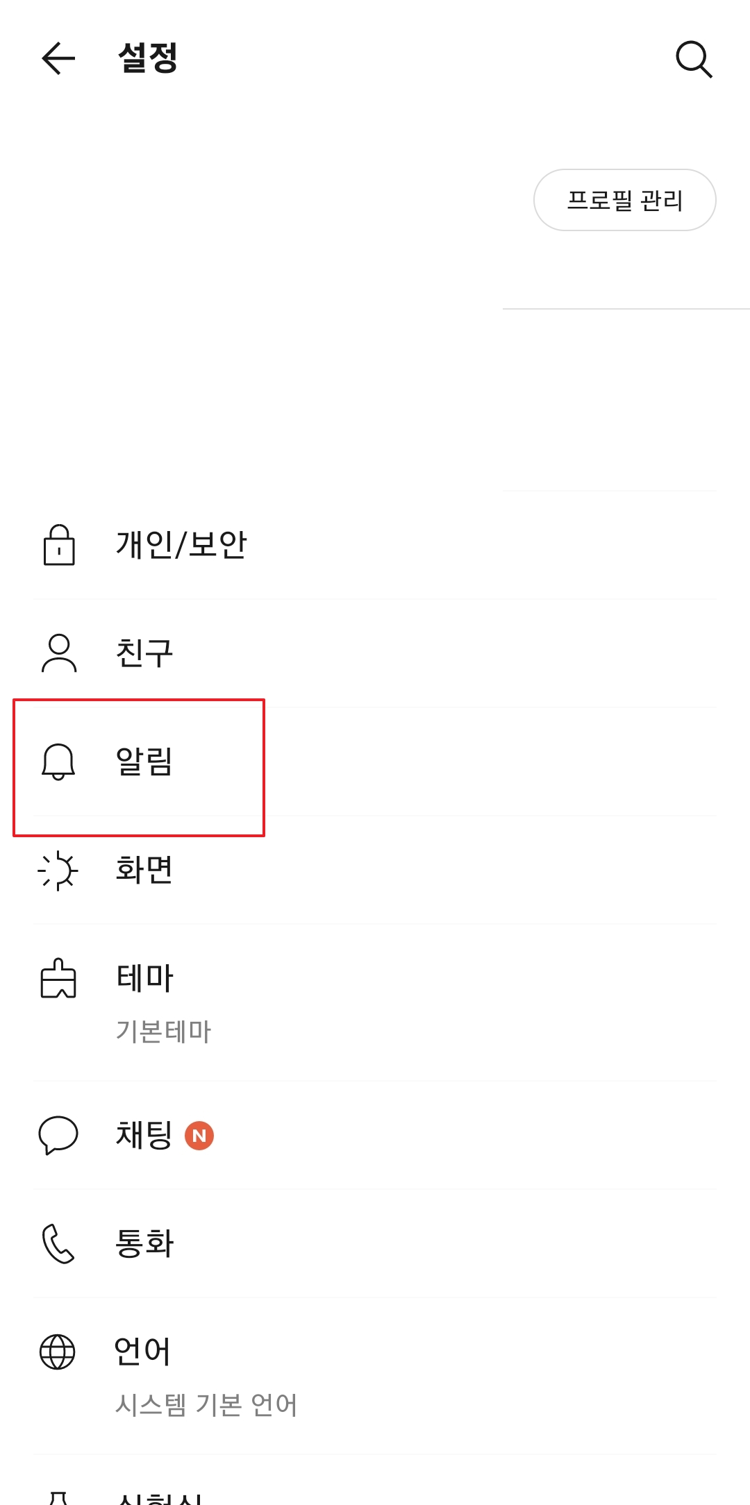 3. 설정 페이지에서 알림 메뉴를 선택합니다. 이곳에서는 카카오톡과 관련된 모든 알림 설정을 관리할 수 있습니다.