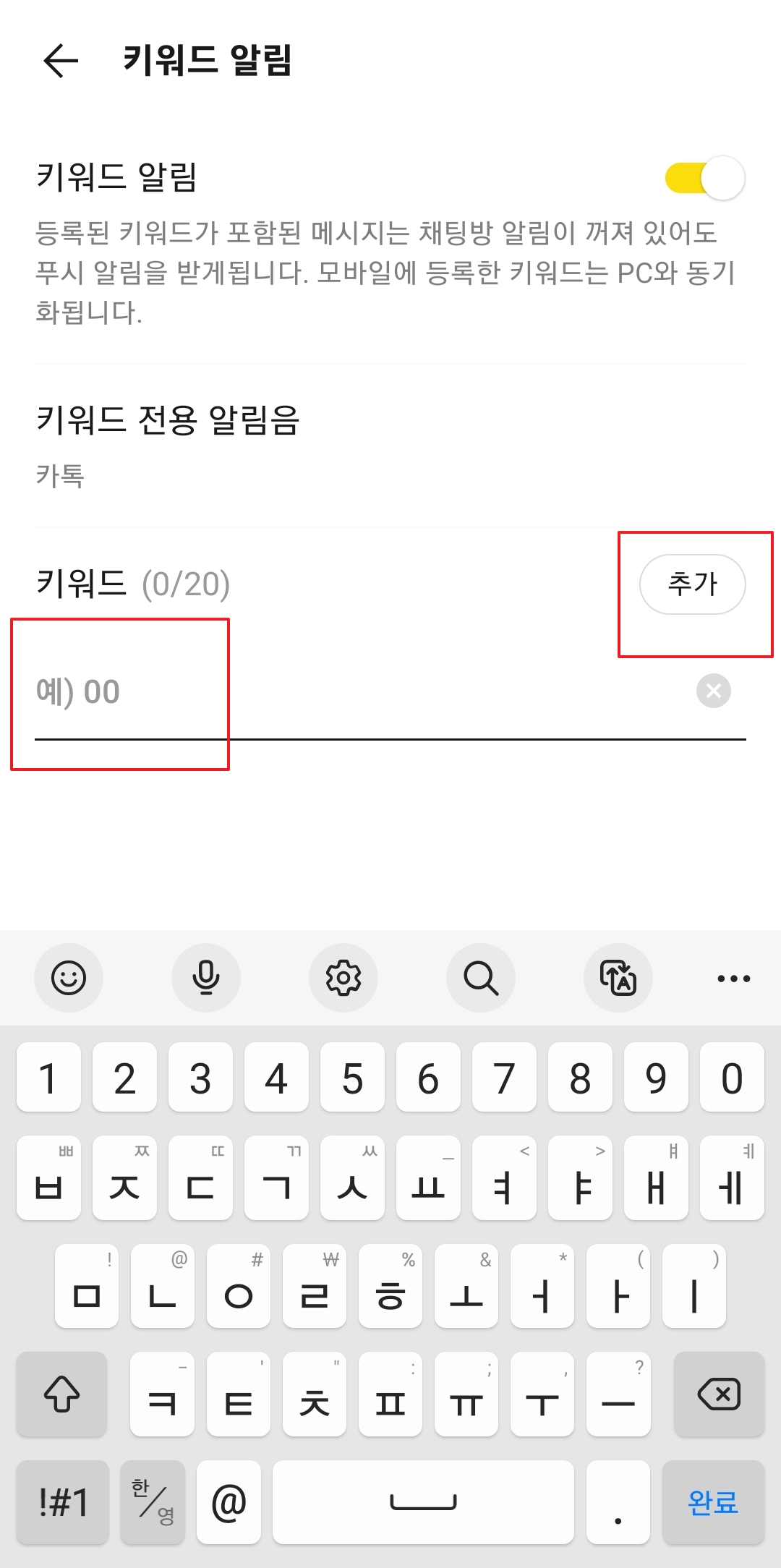 6. 키워드 알림이 활성화되면 하단에 키워드를 추가할 수 있는 입력 창이 나타납니다. 키워드는 최대 20개까지 등록이 가능하며, 키워드가 대화 중 언급될 경우 알림을 받을 수 있습니다.