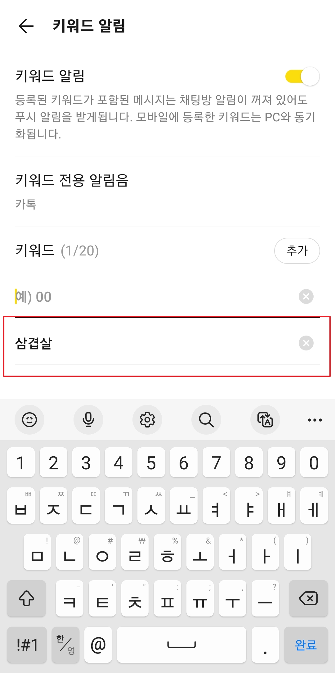 키워드를 추가한 후, 알림을 받을 필요가 없어진 단어는 언제든 삭제할 수 있습니다. 등록된 키워드 우측에 있는 X 버튼을 눌러 삭제하면, 해당 키워드는 알림 목록에서 제거됩니다. 예를 들어, 삼겹살이라는 키워드를 추가하면, 해당 단어가 포함된 메시지가 들어올 때마다 별도의 알림을 받을 수 있습니다.