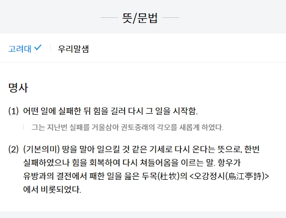 예문으로는 일반그는 지난번 실패를 거울삼아 권토중래의 각오를 새롭게 하였다.일반 이 예문은 어떤 사람이 실패한 경험을 바탕으로 힘을 길러 다시 도전하는 의지를 표현하고 있습니다.