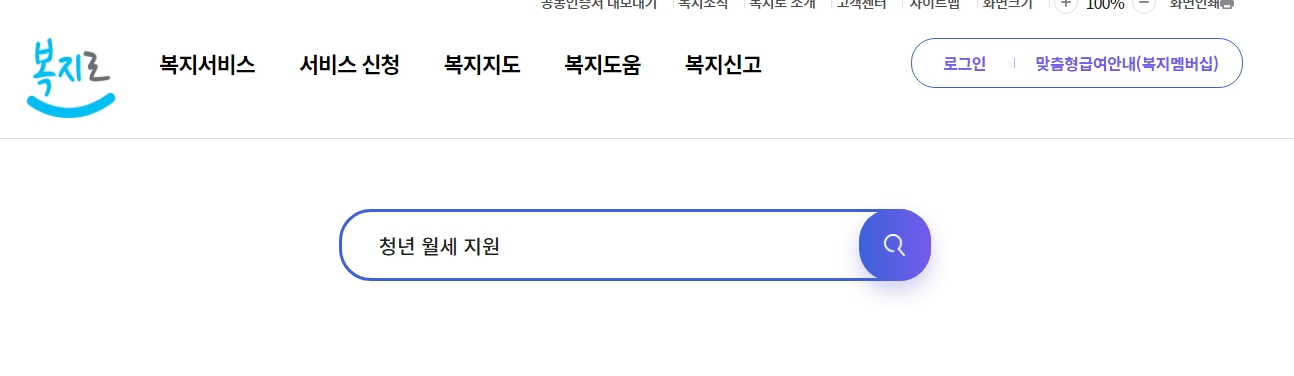 검색창에 청년 월세 지원을 검색합니다. 복지로 홈페이지에서 청년 월세 지원과 관련된 정보를 찾기 위해 검색창을 활용합니다.