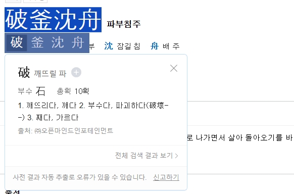 5. 한자어를 풀이해보면, 파(破)는 깨뜨리다 또는 부수다를 의미하며, 부(釜)는 솥을 뜻합니다. 침(沈)은 가라앉히다를 뜻하고, 주(舟)는 배를 의미합니다. 이를 종합하면 문자 그대로 솥을 깨고 배를 가라앉히다로 해석됩니다.