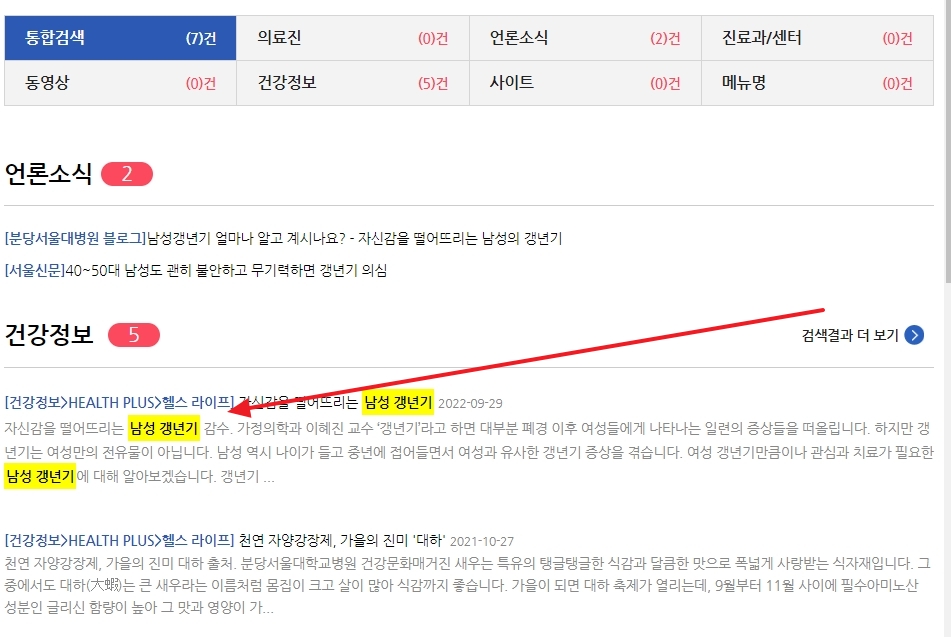 홈페이지의 상단에 위치한 검색창을 이용해 남성 갱년기를 검색한 후, 건강정보 섹션을 클릭합니다. 이를 통해 남성 갱년기에 대한 자세한 정보를 찾을 수 있습니다.