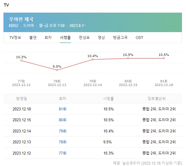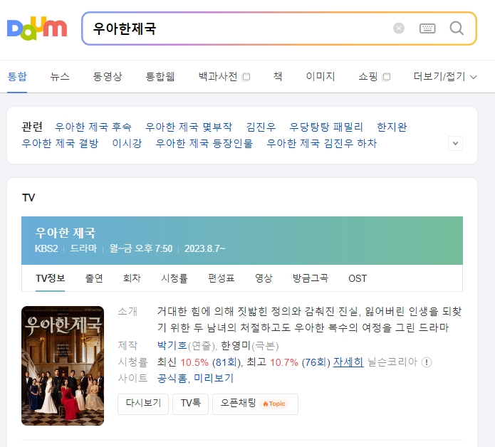 우아한 제국을 검색하면, 드라마에 대한 기본 정보가 나타납니다. 이 정보에는 드라마의 소개, 제작진, 시청률, 공식 사이트 링크 등이 포함되어 있어, 드라마에 대한 개요를 한눈에 파악할 수 있습니다.