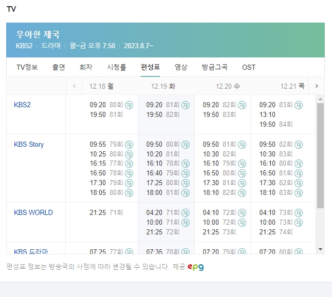 편성표를 확인해보면, 재방송이 하루 종일 여러 차례 방송되고 있습니다. 특히 KBS 스토리, 월드, 드라마 등의 채널에서 자주 방영되고 있어, 다양한 시간대에 시청할 수 있는 기회가 많은 것으로 나타납니다.